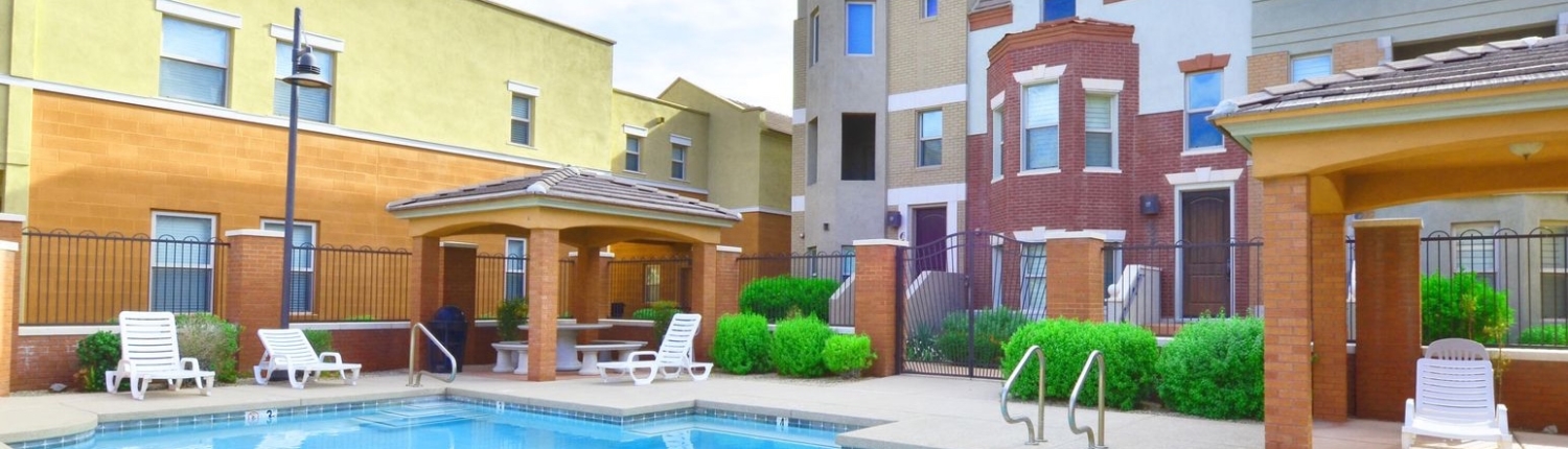 Brownstone at Hyde Park, aka Brownstone Tempe, is a unique community of 65 brownstone-style townhomes and looks like it belongs back east. Many of these 2 and 3 story townhomes are well appointed, with granite counters and tile or wood floors. Though floor plans differ, the 3-story units have the living space on the 2nd floor, with the master on the third floor and the 2nd bedroom on the ground floor. Every unit has either a one-car garage or two-car garage.