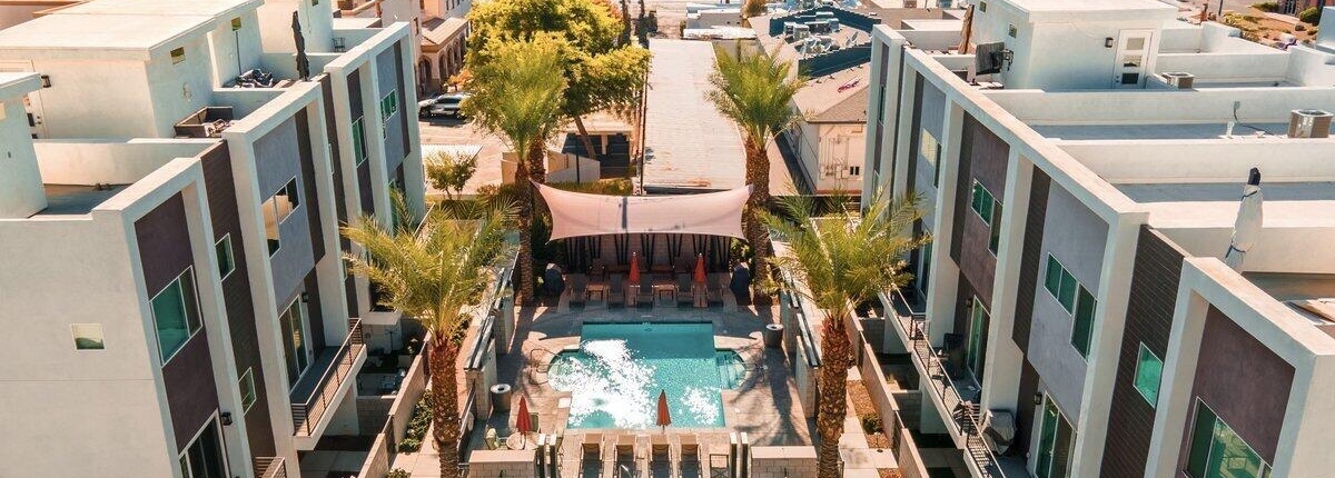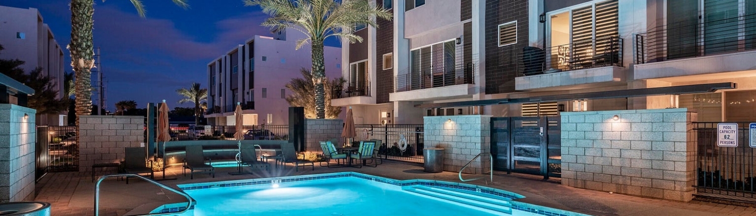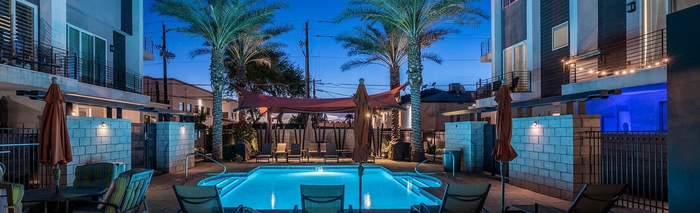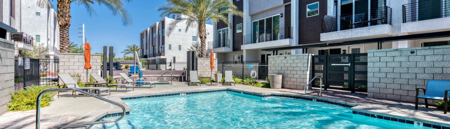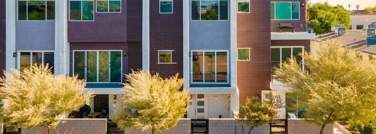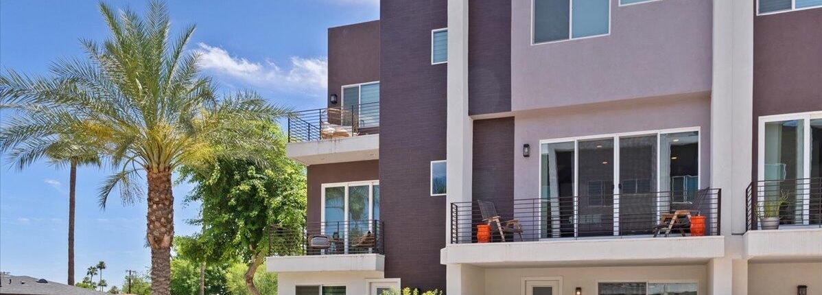 Encue is a modern condominium community located in the Biltmore District, close to shopping, restaurants and entertainment. The community includes 46 three-level townhomes featuring: 10 foot ceilings, roomy balconies and open living spaces with quartz counters and high-end appliances in the kitchen. Some condos have elevators. Community amenities include a community pool and spa.