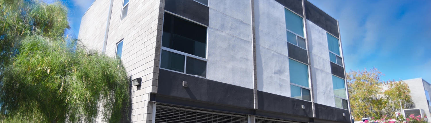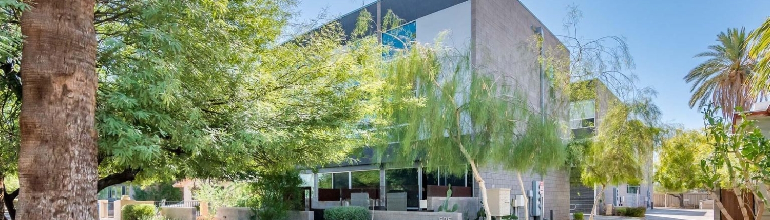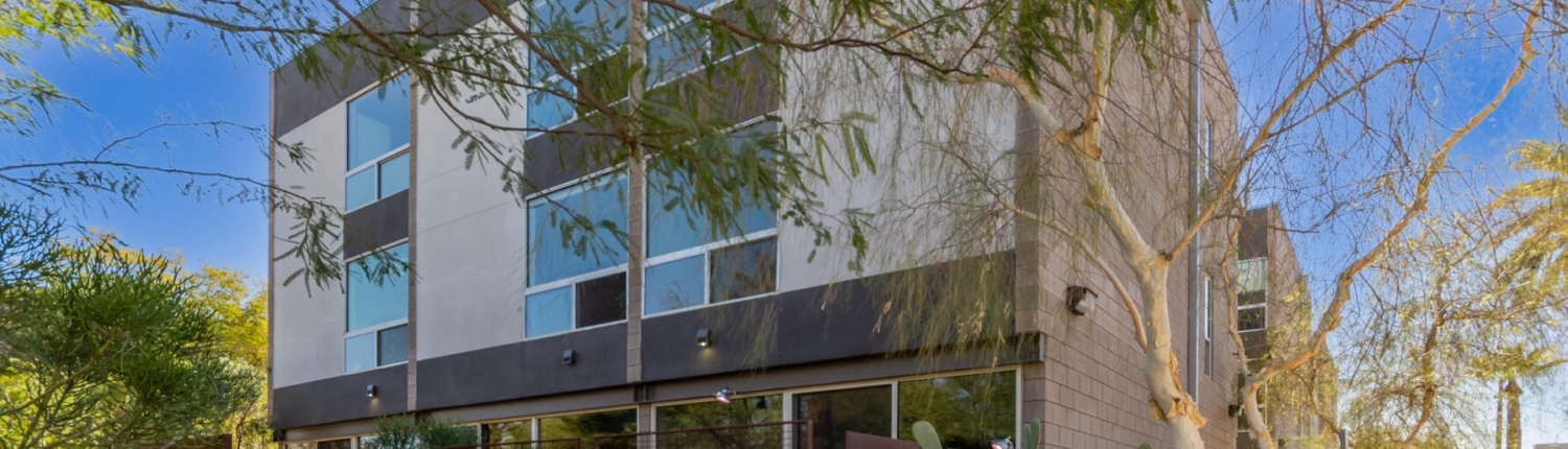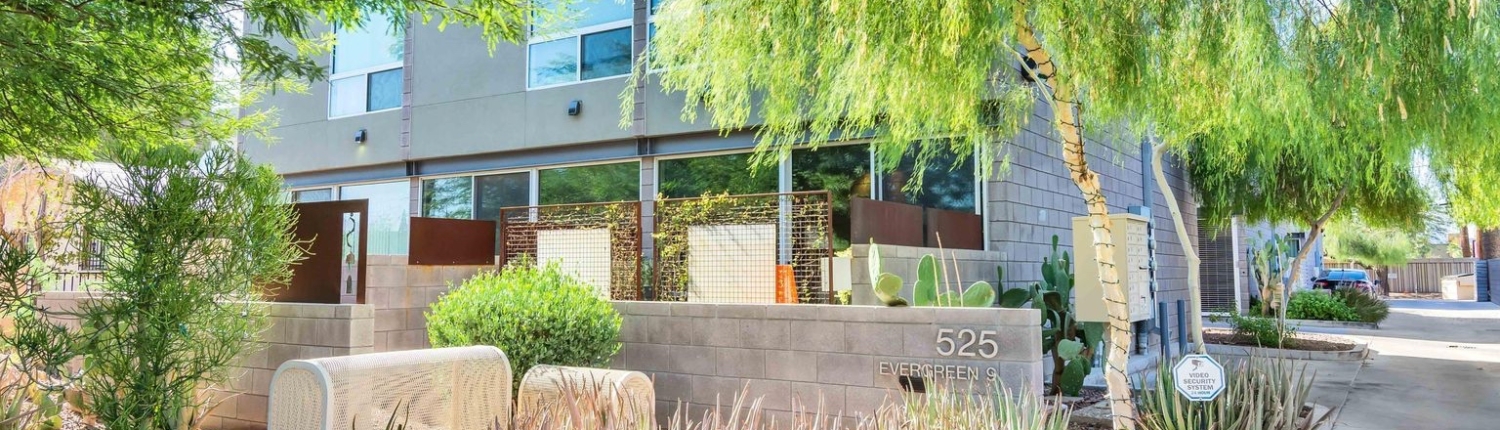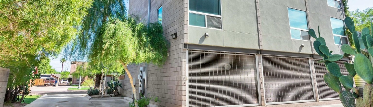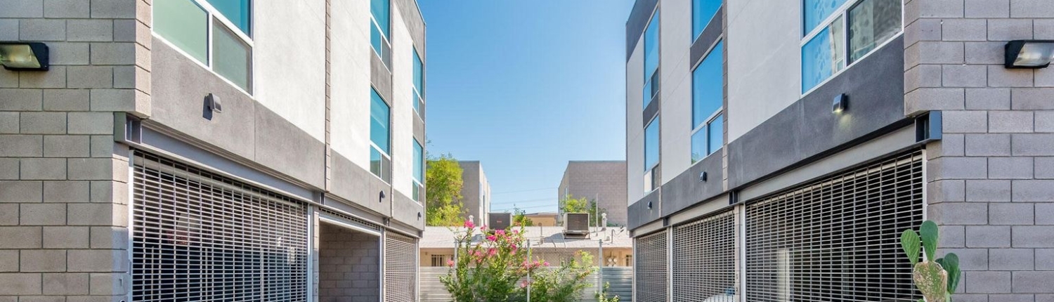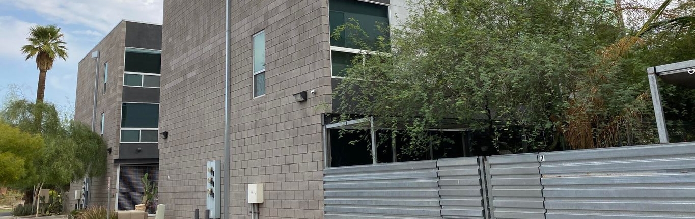 Evergreen 9 is a stylish modern infill project just off 7th street and the I-10 freeway in Downtown Phoenix. This community features nine three-story townhomes encased within sandblasted concrete block, featuring an oversized one-car garage with a really unique aluminum coil garage gate.