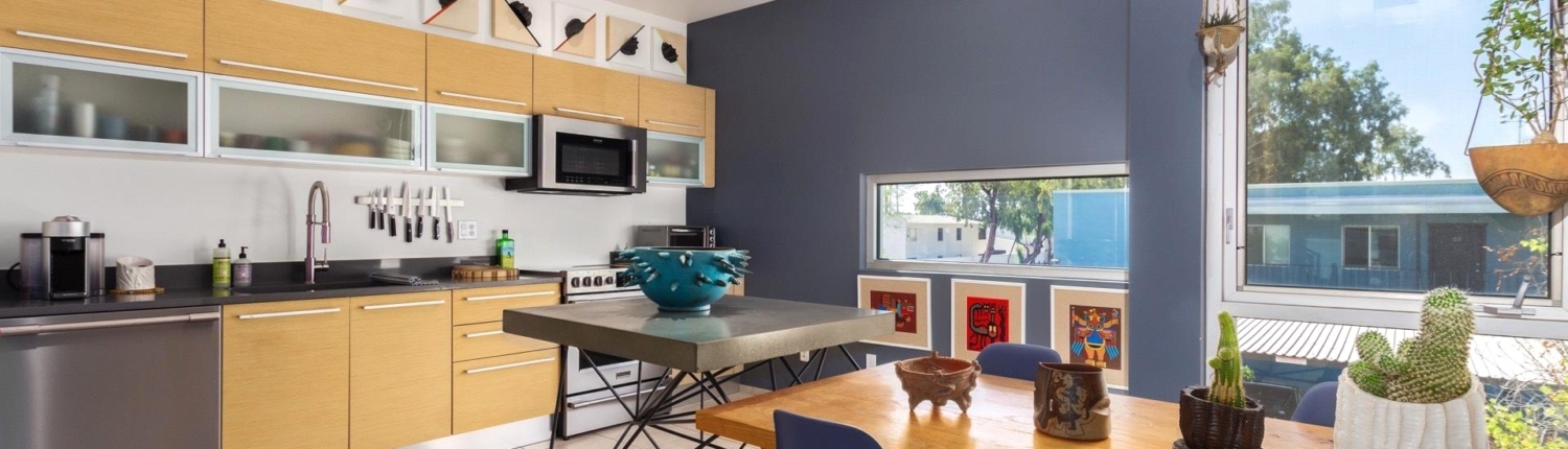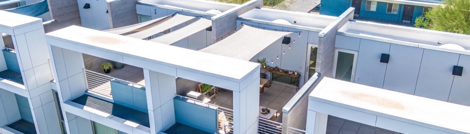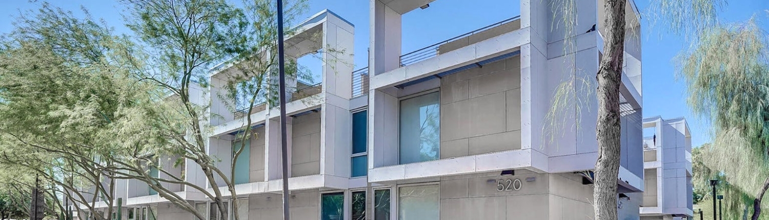 Skye 15, aka Tempe Urban Living, is a uniquely designed 15-unit urban townhome community. Located half a mile west of Mill Avenue, residents living here can enjoy the vast amenities downtown Tempe has to offer. Each townhome is 3-stories, parking space below along with a den area, living room and kitchen in the mid-section, and a rooftop deck. Of the 15-units, there are 1, 2 & 3 bedroom floor plans, ranging from 1,170 square feet to 2,758 square feet. The interiors reflect a cutting edge contemporary style with exposed concrete block walls, floor-to-ceiling windows, exposed ductwork, modern tile flooring and sleek european-style kitchens.