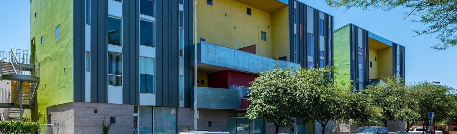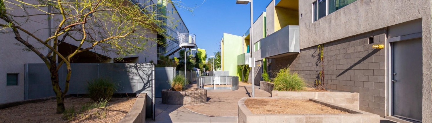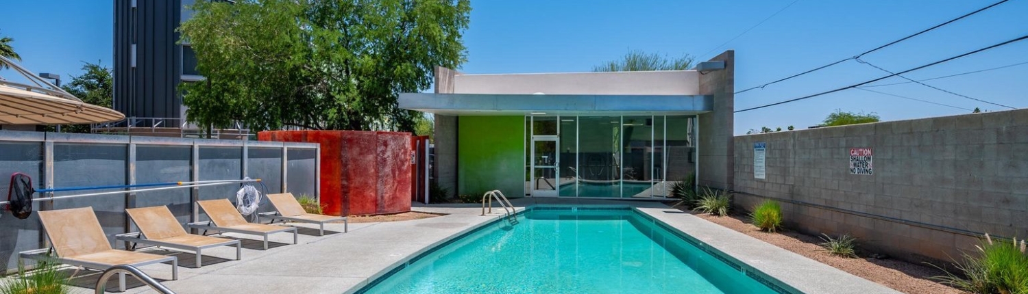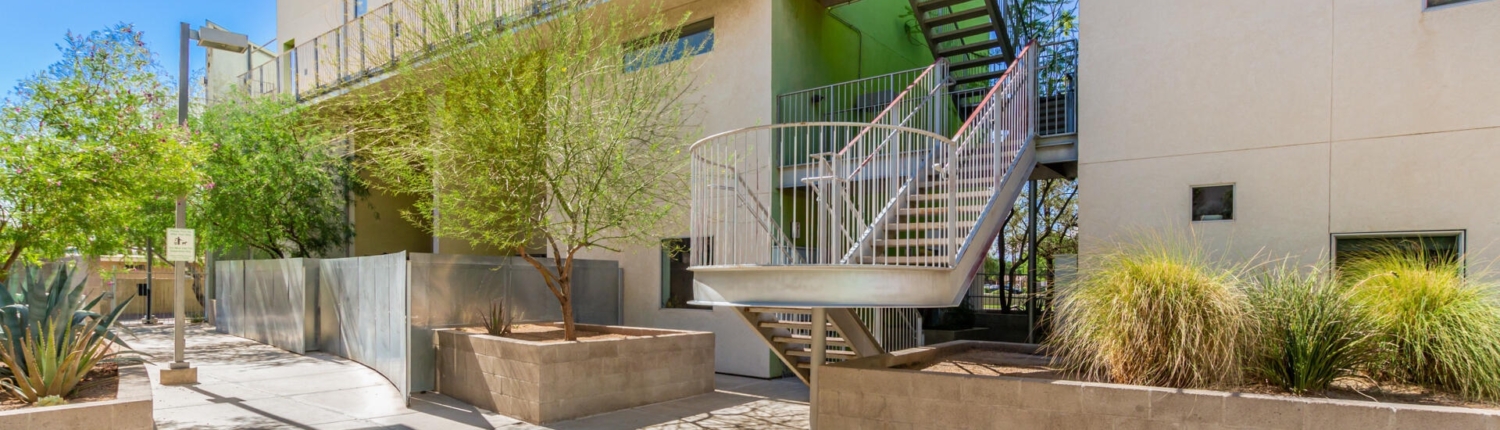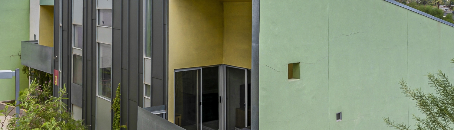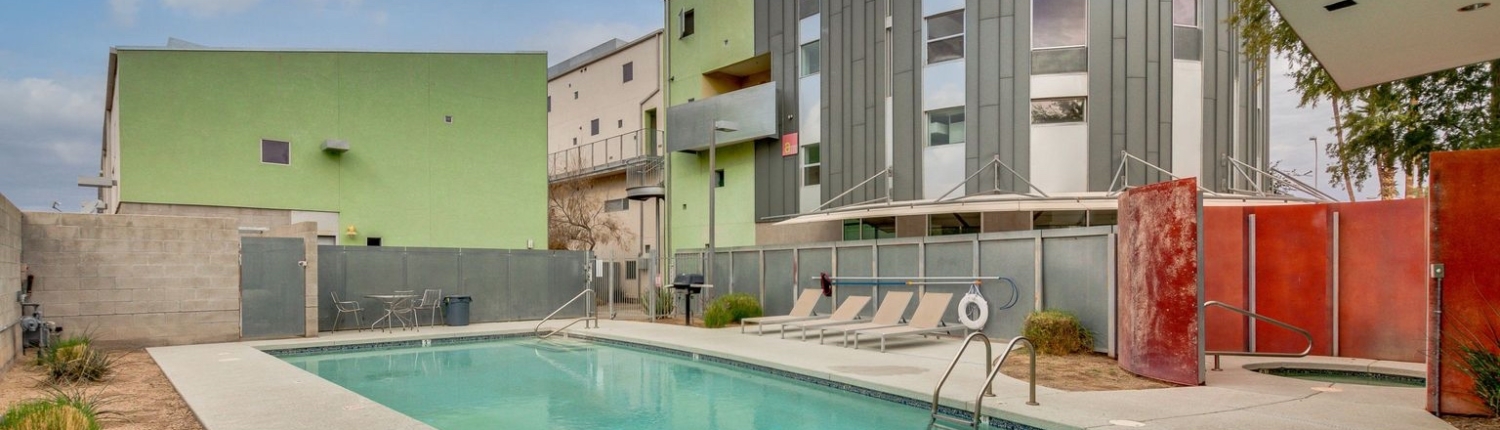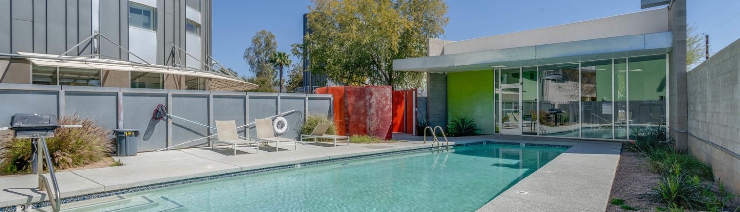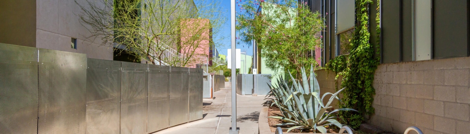 The Vale in Tempe is another prize community designed by the famous southwest architect, Will Bruder. Built in 2005, this 47-unit community features studio lofts, 1, 2 and 3 bedroom floor plans ranging from 864 square feet up to 2,257 square feet. Some ground floor units have live-work arrangements with outside entries. Vale condos enjoy secure gated entry, private balconies or patios, individual storage units, a petite fitness center, and a lap pool and Jacuzzi.